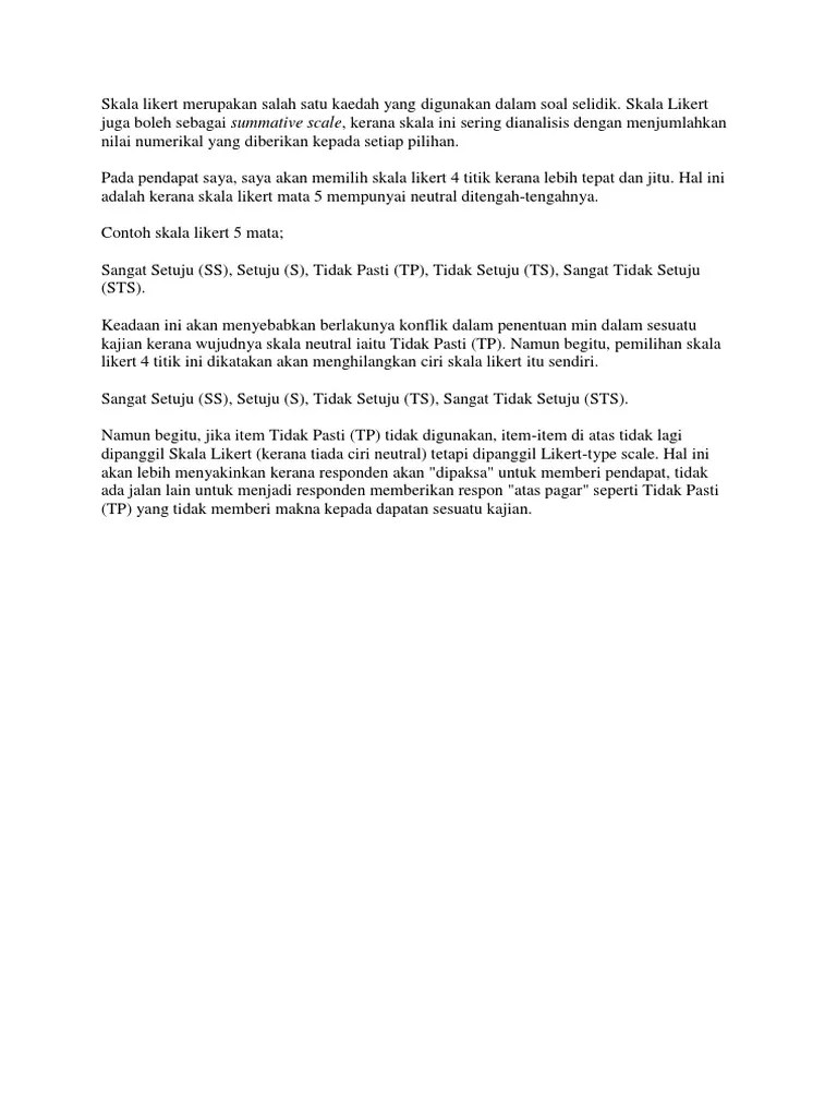Berdasarkan interpretasi skor min skala likert empat mata yang digunakan, . 4) dalam soal selidik (bahagian b). Skala sikap skala likert skala guttman skala simantic differensial ppt. Dengan menanda takat atau unit pada skala likert 4 yang ditetapkan iaitu 1. Pertanyaan positif diberi skor 5, 4, 3, 2, dan 1; . Pengertian skala likert dan contoh cara hitung kuesionernya diedit com . 1 jadual skala likert download table. Die skalen bestehen aus mehreren . Item likert selalunya menawarkan kategori respons pada skala 1 hingga 5, tetapi pelbagai pilihan boleh dilakukan, termasuk skala 1 hingga 7 dan 0 hingga 4 atau . Skala likert 5 mata malay news. Didapati daripada 20 soalan tertutup yang menggunakan skala likert 4 mata (1 hingga. You have just read the article entitled skala likert 4 mata.